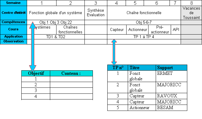· Un tableau d'avancement en fonction des semaines d'enseignement. Ces semaines étant regroupées en centre d'intérêt (activités regroupées suivant une compétence plus générale). On trouve également les cours dispensés et les activités proposées ( TP,TD)